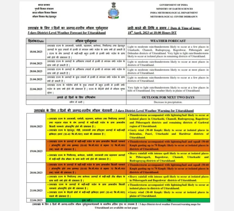मौसम विज्ञान केंद्र द्वारा जारी पूर्वानुमान के मुताबिक 19 और 20 अप्रैल को उत्तराखंड राज्य के जनपदों में कहीं-कहीं गर्जन के साथ आकाशीय बिजली चमकने ओलावृष्टि और झक्कड़ 50 से 60 किलोमीटर प्रति घंटे से बढ़कर 70 किलोमीटर प्रति घंटे के हिसाब से चलने की संभावना है जिसको लेकर ऑरेंज अलर्ट जारी किया गया है।