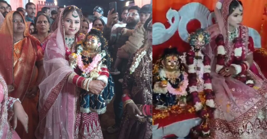 Badaun News: उत्तर प्रदेश के बदायूं से एक अनोखी शादी लगातार सुर्खियों में बनी हुई है, जहाँ पिंकी शर्मा नाम की लड़की ने पूरे हिंदू रीति-रिवाजों के साथ भगवान श्रीकृष्ण के साथ शादी रचाई है। इस शादी में पूरा गांव शामिल हुआ। इसमें दावत, हल्दी और लग्न की रस्में भी हुईं।