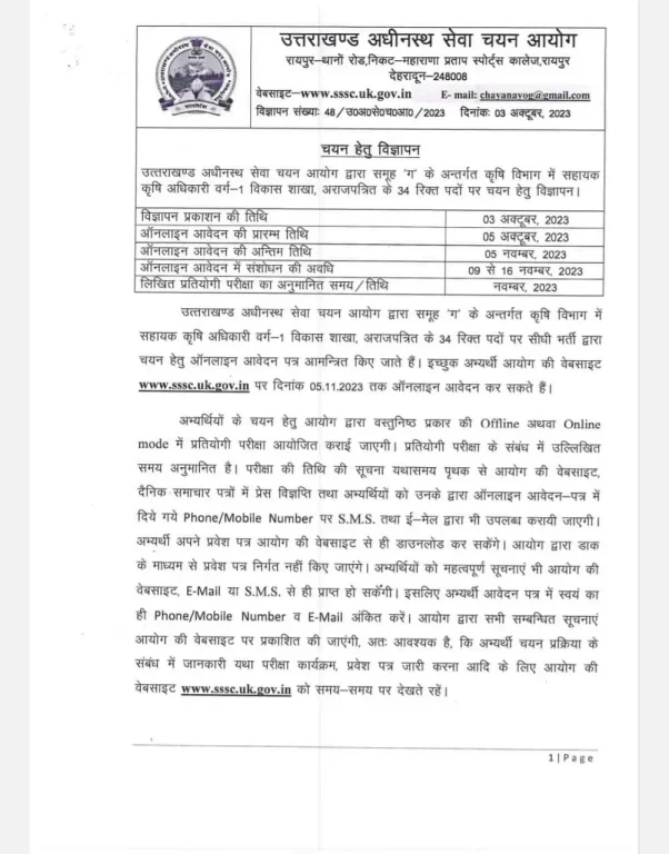 देहरादून : उत्तराखंड में सरकारी नौकरी की तैयारी कर रहे युवाओं के लिए अच्छी खबर है। उत्तराखण्ड अधीनस्थ सेवा चयन आयोग ने समूह ‘ग’ के अन्तर्गत कृषि विभाग में सहायक कृषि अधिकारी वर्ग-1 विकास शाखा, अराजपत्रित के रिक्त पदों के लिए आवेदन आमंत्रित किए हैं।