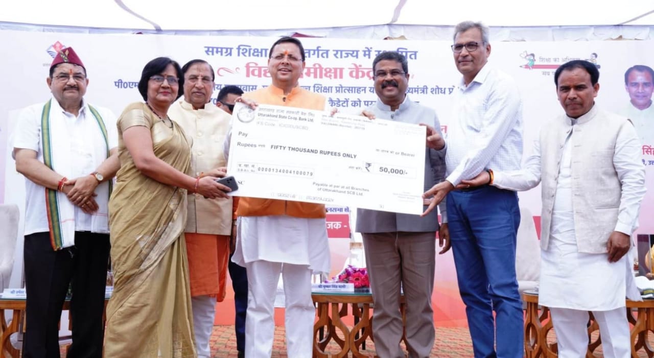 देहरादून : मुख्यमंत्री पुष्कर सिंह धामी एवं केन्द्रीय शिक्षा मंत्री धर्मेन्द्र प्रधान ने मंगलवार को ननूरखेड़ा स्थित शिक्षा निदेशालय में राज्य के विद्या समीक्षा केन्द्र का लोकार्पण किया। इस अवसर पर राज्य के 141 पी.एम.श्री विद्यालयों एवं नेताजी सुभाष चन्द्र बोस आवासीय विद्यालय का शिलान्यास भी किया गया। मुख्यमंत्री एवं केन्द्रीय शिक्षा मंत्री ने राज्य में मुख्यमंत्री उच्च शिक्षा मेधावी छात्रवृत्ति योजना एवं मुख्यमंत्री उच्च शिक्षा शोध प्रोत्साहन योजना का शुभारंभ भी किया। कार्यक्रम में एन.डी.ए एवं आई.एम.ए में चयनित कैडेट को पुरूस्कार की धनराशि भी प्रदान की गई।