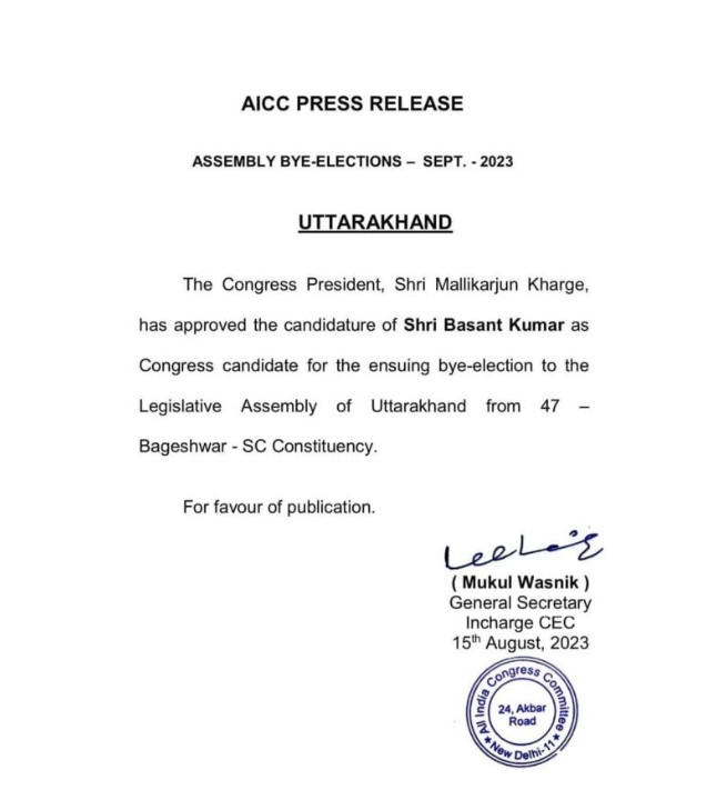 उत्तराखंड कांग्रेस से बड़ी खबर: कांग्रेस के द्वारा बागेश्वर उपचुनाव को लेकर प्रत्याशी के नाम का ऐलान