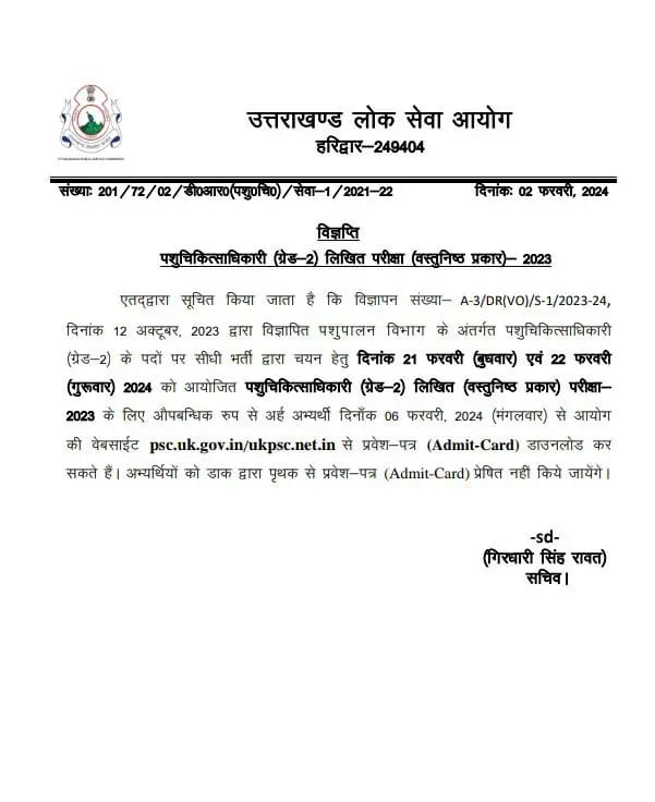 देहरादून : एतद्वारा सूचित किया जाता है कि विज्ञापन संख्या A-3/DR(VO)/S-1/2023-24, दिनांक 12 अक्टूबर, 2023 द्वारा विज्ञापित पशुपालन विभाग के अंतर्गत पशुचिकित्साधिकारी (ग्रेड-2) के पदों पर सीधी भर्ती द्वारा चयन हेतु दिनांक 21 फरवरी (बुधवार) एवं 22 फरवरी (गुरुवार) 2024 को आयोजित पशुचिकित्साधिकारी (ग्रेड-2) लिखित (वस्तुनिष्ठ प्रकार) परीक्षा- 2023 के लिए औपबन्धिक रुप से अर्ह अभ्यर्थी दिनाँक 06 फरवरी, 2024 (मंगलवार) से आयोग की वेबसाईट psc.uk.gov.in/ukpsc.net.in से प्रवेश-पत्र (Admit Card) डाउनलोड कर सकते हैं। अभ्यर्थियों को डाक द्वारा पृथक से प्रवेश-पत्र (Admit Card) प्रेषित नहीं किये जायेंगे।