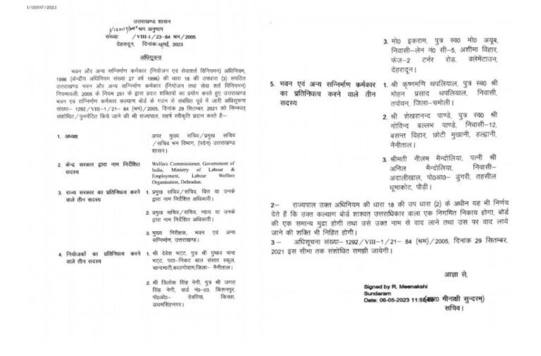 भवन और अन्य सन्निर्माण कर्मकार ( नियोजन एवं सेवाशर्त विनियमन) अधिनियम, 1996 (केन्द्रीय अधिनियम संख्या 27 वर्ष 1996 ) की धारा 18 की उपधारा (3) सपठित उत्तराखण्ड भवन और अन्य सन्निर्माण कर्मकार ( नियोजन तथा सेवा शर्त विनियमन) नियमावली, 2005 के नियम 251 के द्वारा प्रदत्त शक्तियों का प्रयोग करते हुए उत्तराखण्ड भवन एवं सन्निर्माण कर्मकार कल्याण बोर्ड के गठन से संबंधित पूर्व में जारी अधिसूचना संख्या- 1292 / VIII– 1 / 21- 84 (श्रम) / 2005, दिनांक 29 सितम्बर, 2021 को निम्नवत् संशोधित / पुनर्गठित किये जाने की श्री राज्यपाल, सहर्ष स्वीकृति प्रदान करते हैं: