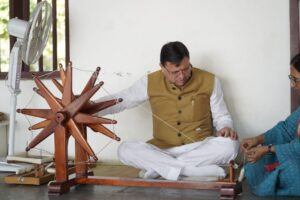 मुख्यमंत्री धामी अहमदाबाद में पहुँचे गांधी आश्रम, चलाया चरखा, राष्ट्रपिता को किया याद