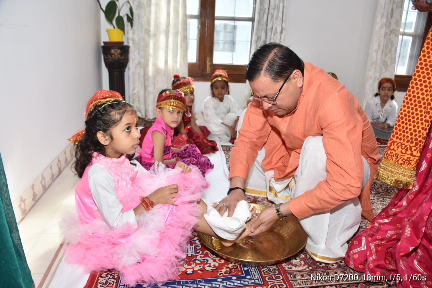 मुख्यमंत्री पुष्कर सिंह धामी ने नवमी के पावन अवसर पर विधि विधान से कन्या पूजन किया।
