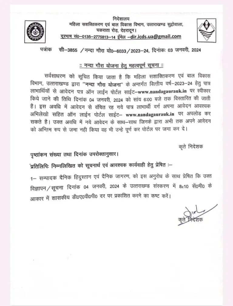 सर्वसाधरण को सूचित किया जाता है कि महिला सशाक्तिकरण एवं बाल विकास विभाग, उत्तराखण्ड द्वारा “नन्दा गौरा योजना” के अन्तर्गत वित्तीय वर्ष-2023-24 हेतु पात्र लाभार्थियों से आवेदन पत्र ऑन लाईन पोर्टल साईट www.nandagaurauk.in पर स्वीकार किये जाने की तिथि दिनांक 04 जनवरी, 2024 को सांय 6:00 बजे तक विस्तारित की जाती है। इस अवधि में आवेदन से वंचित रह गये पात्र लाभार्थी वर्ग अपना आवेदन आवश्यक अभिलेखो सहित ऑन लाईन पोर्टल साईट www.nandagaurauk.in पर अपलोड कर सकते है। उक्त अवधि में नये आवेदन के साथ-साथ जिनके द्वारा अभी तक अपने आवेदन को अन्तिम रुप से जमा नही किया