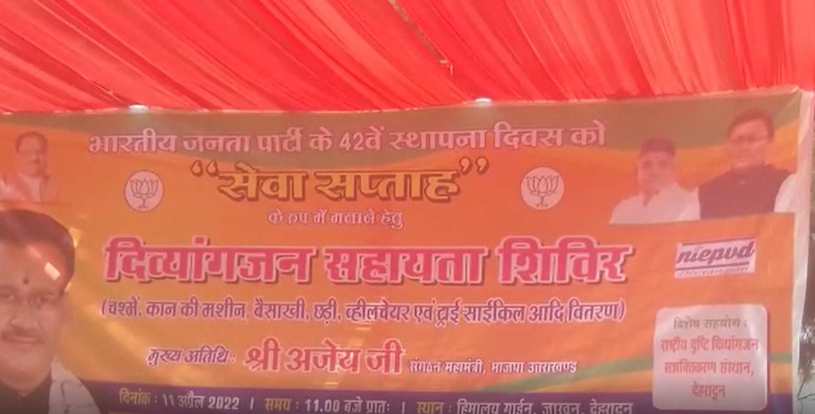 जिसमें कैबिनेट मंत्री गणेश जोशी मुख्य अतिथि के रूप में संगठन महामंत्री अजय जी ने शिरकत की। कार्यकर्म में जरूरत दिवयांग लोगो को वीलचैयर चश्मा साइकल बैसाखी का वितरण किया गया कार्यकर्म में गणेश जोशी ने बताया की देश भर में भाजपा स्थापना दिवस सेवा के रूप में माना रही है इस कार्य में पार्टी दिव्यांग जरूरत मंद लोगो सहायता देने का कार्य कर रही है।