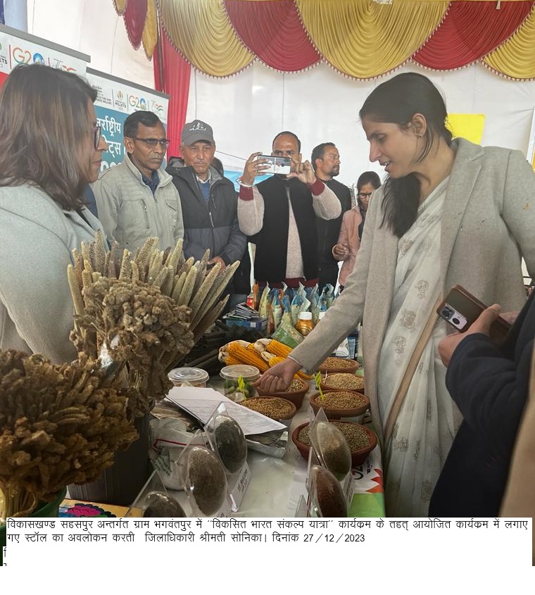 इसी क्रम में आज जनपद विकासखण्ड सहसपुर अन्तर्गत ग्राम भगवंतपुर में जिलाधिकारी सोनिका ने ‘‘विकसित भारत संकल्प यात्रा’’ कार्यक्रम के तहत् आयोजित बहुउद्देशीय शिविर के अन्तर्गत कार्यक्रम स्थल पर लगाए गए विभिन्न विभागों के स्टॉल का अवलोकन करते हुए आवश्यक दिशा-निर्देश दिए।