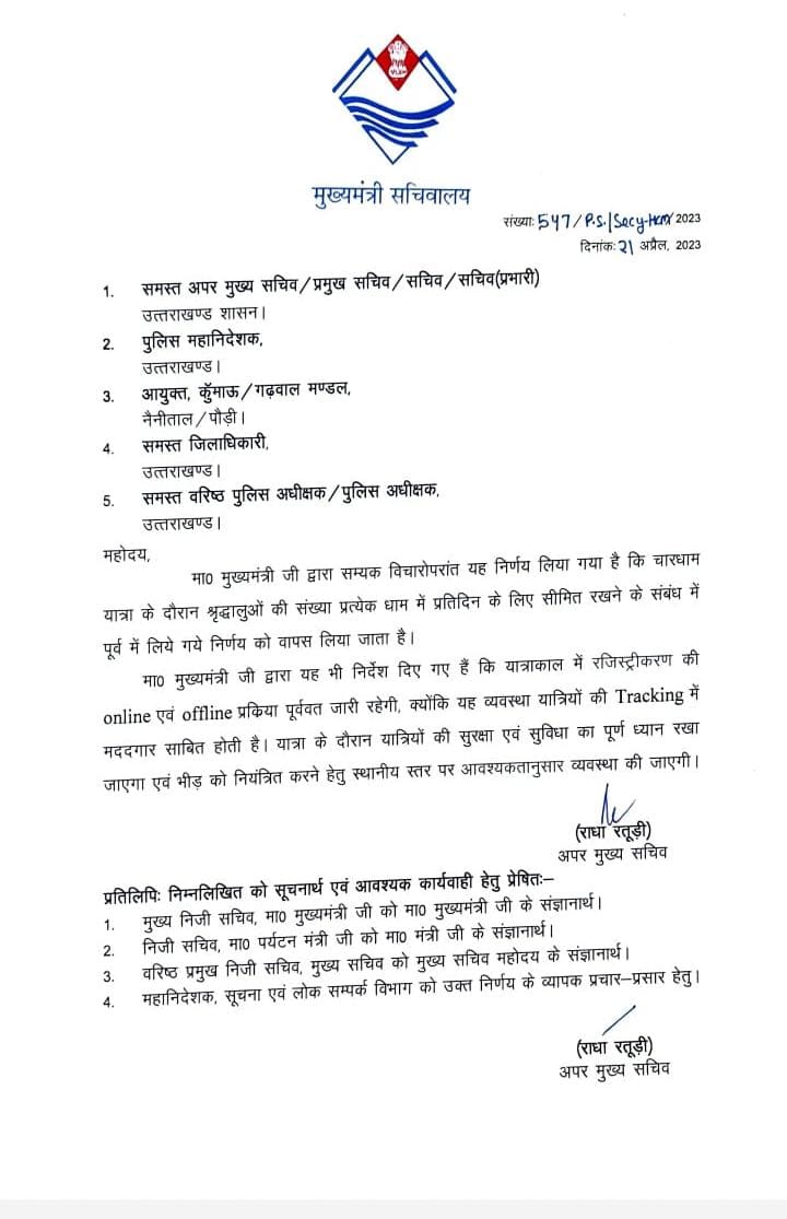 उत्तराखंड चारधाम यात्रा से जुड़े सभी लोगों को सरकार ने राहत दे दी हैं, पूर्व में जारी धामों में श्रद्धालुओं की सिमित संख्या के आदेश को वापस ले लिया गया है, अब सभी श्रद्धालु दर्शन कर सकेंगे !
