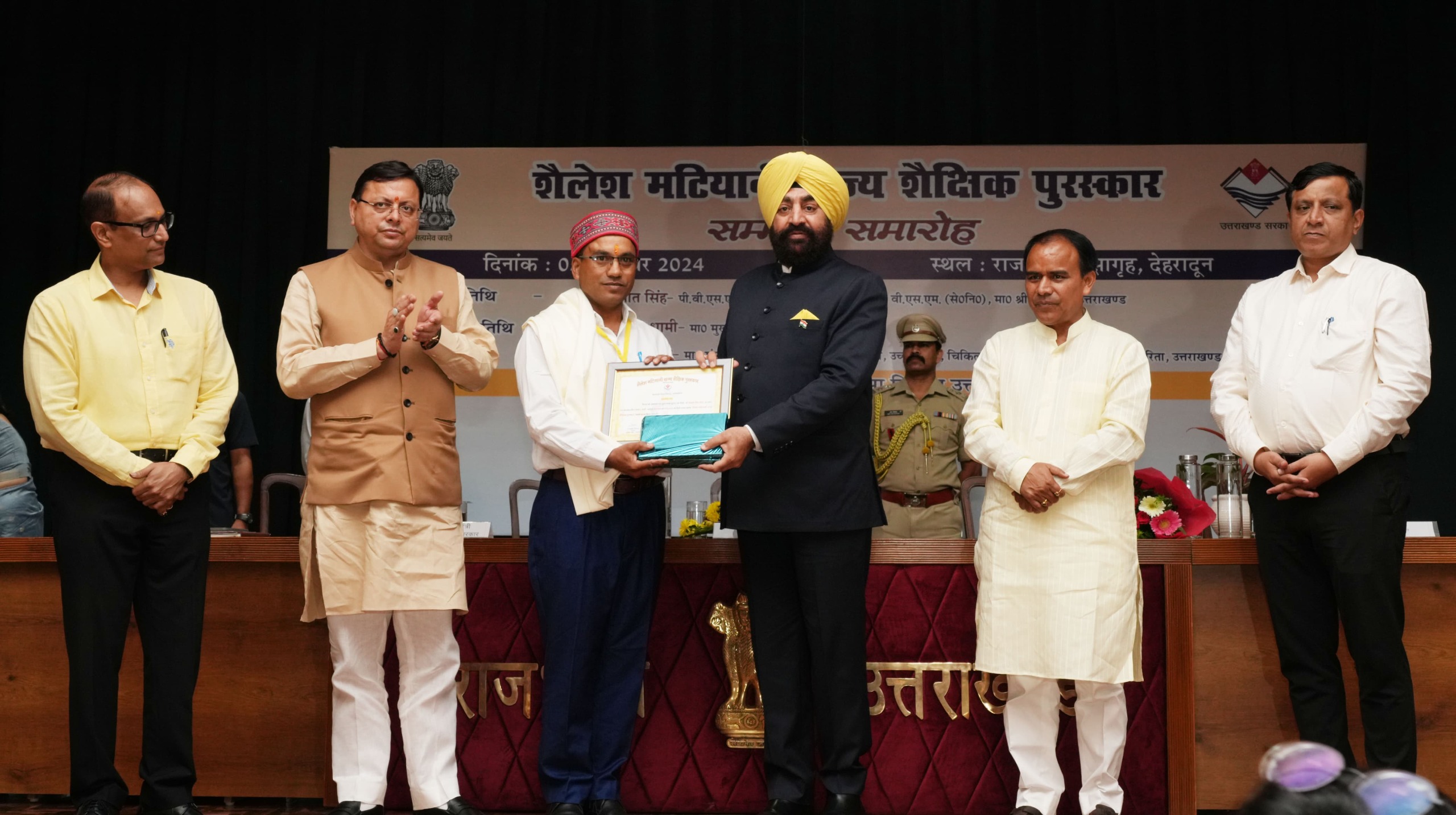 राजभवन देहरादून 05 सितम्बर, 2024 ‘‘शैलेश मटियानी राज्य शैक्षिक पुरस्कार’’ सम्मान समारोह में राज्यपाल लेफ्टिनेंट जनरल गुरमीत सिंह (से नि), मुख्यमंत्री पुष्कर सिंह धामी और शिक्षा मंत्री डॉ. धन सिंह रावत ने वर्ष 2023 में शैलेश मटियानी राज्य शैक्षिक पुरस्कारों के लिए चयनित शिक्षक एवं शिक्षिकाओं को सम्मानित किया। शिक्षक दिवस के अवसर पर राजभवन में आयोजित सम्मान समारोह में वर्ष 2023 के लिए चयनित 19 शिक्षकों एवं शिक्षिकाओं को पुरस्कार प्रदान किए गए है। (सूची संलग्न)