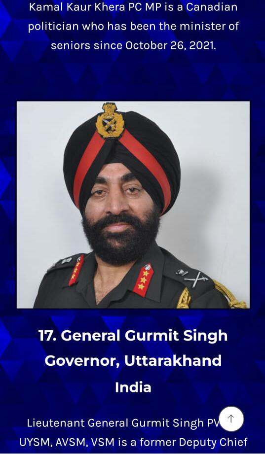 देवभूमि उत्तराखंड के यशस्वी राज्यपाल Lt Gen Gurmit Singh साहब को ‘TheSikh100.com’ की ओर से पूरे संसार में 100 सबसे ताकतवर सिख समुदाय के लोगों की सूची में “17 वां स्थान” दिया गया है! यह बहुत बड़ी यशता का प्रतीक है। जनरल साहब को हार्दिक बधाई एवं शुभकामनाएं!