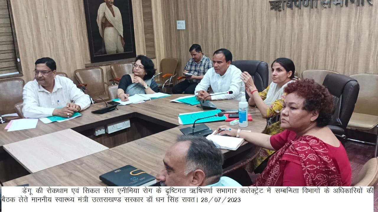 देहरादून : स्वास्थ्य मंत्री उत्तराखण्ड सरकार धन सिंह रावत ने ऋषिपर्णा सभागार कलेक्ट्रेट में डेंगू संबंधी रेखीय विभाग के अधिकारियों के साथ एवं सिकल सैल एनीमिया रोक के दृष्टिगत बैठक लेते हुए संबंधित विभागीय अधिकारियों को आवश्यक दिशा-निर्देश दिए।