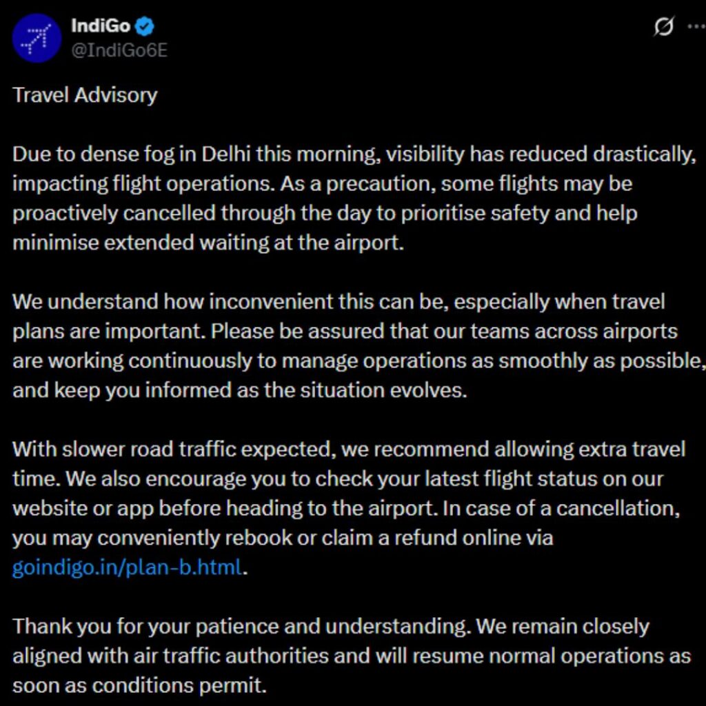 एयरलाइन ने यात्रियों से कहा है कि कोहरे के कारण सड़कों पर ट्रैफिक धीमा रह सकता है, इसलिए एयरपोर्ट जाने की योजना पहले से बनाएं। साथ ही यात्रा से पहले इंडिगो की वेबसाइट या मोबाइल ऐप पर अपनी फ्लाइट का लेटेस्ट स्टेटस जरूर चेक करें। अगर फ्लाइट कैंसिल होती है, तो यात्री ऑनलाइन आसानी से फ्लाइट रीबुक कर सकते हैं या रिफंड क्लेम कर सकते हैं।