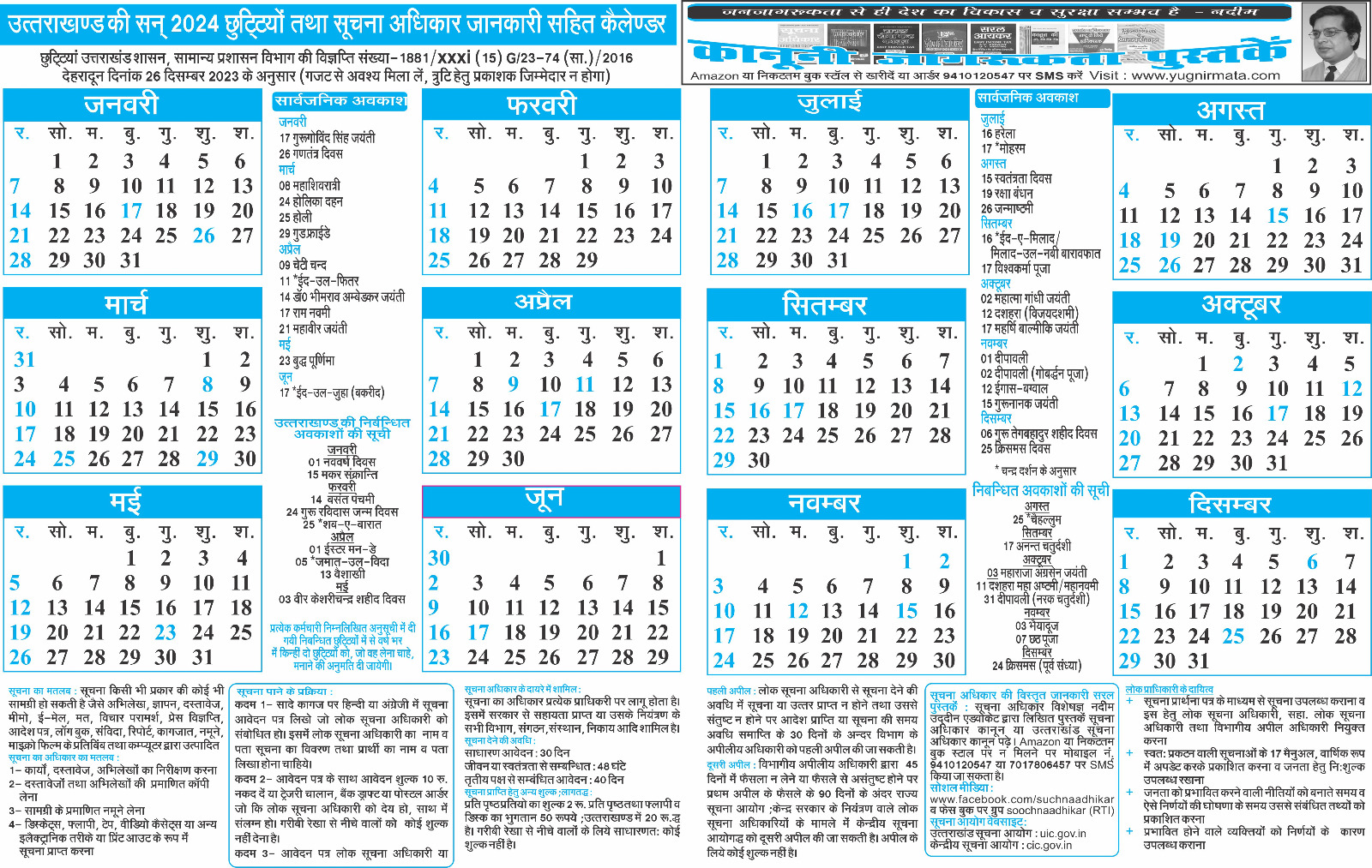 इसके लिये सूचना अधिकार विशेषज्ञ नदीम उद्दीन एडवोकेट द्वारा एक कैलेंडर प्रकाशित कराया गया है। जिसमें 2024 के कैलेंडर के साथ उत्तराखंड सरकार के राजपत्रित व निबंधित अवकाशों की सूची को भी दर्शाया गया है।