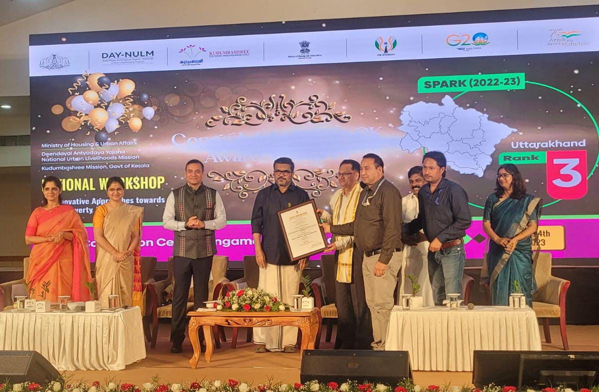 अपर निदेशक शहरी विकास अशोक पांडेय जी ने बताया कि शहरी विकास एवं आवास मंत्री जी एवं अपर मुख्य सचिव एवं प्रमुख सचिव शहरी विकास विभाग तथा निदेशक शहरी विकास निदेशालय के कुशल मार्गदर्शन में योजनान्तर्गत उत्कृष्ट प्रदर्शन किये जाने के फलस्वरूप आवासन एवं शहरी कार्य मंत्रालय भारत सरकार द्वारा राज्यों की स्पार्क (Systematic Progressive Analytical Real Time Ranking) रैकिंग में उत्तराखण्ड राज्य को (डे० एन०यू०एल०एम०) के अंतर्गत वित्तीय वर्ष 2021-22 में पूर्वोत्तर एवं हिमालयी राज्यों की श्रेणी में तृतीय स्थान प्राप्त करने पर प्रशस्ती प्रपत्र से सम्मानित एवं रू0 2.00 करोड़ की धनराशि से पुरूस्कृत किया गया।