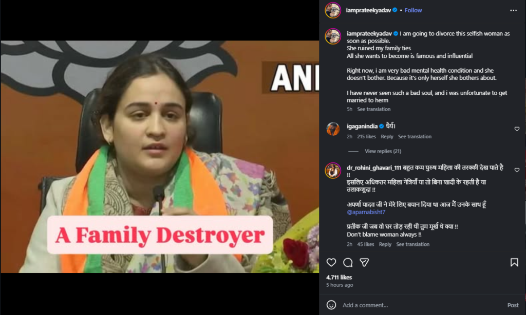 प्रतीक यादव ने अंग्रेजी में पोस्ट किया: ‘मैं इस मतलबी औरत को जल्द से जल्द तलाक देने जा रहा हूं। उसने मेरे परिवार के रिश्ते खराब कर दिए। वह बस मशहूर और असरदार बनना चाहती है। अभी मेरी मेंटल हेल्थ बहुत खराब है और उसे कोई फर्क नहीं पड़ता क्योंकि उसे सिर्फ अपनी ही चिंता है। मैंने इतनी बुरी औरत कभी नहीं देखी। मैं बदकिस्मत था कि मेरी शादी उससे हुई।’