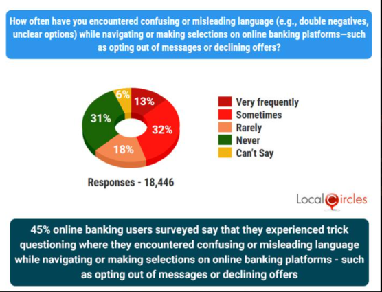 और भी हैं जैसे सब्सक्रिप्शन ट्रैप, बैट एंड स्विच, ट्रिक क्वेश्चनिंग। LocalCircles सर्वे में 8 प्रकार के डार्क पैटर्न पाए गए। औसतन हर बैंक ऐप में 4 से 7 डार्क पैटर्न चल रहे थे।