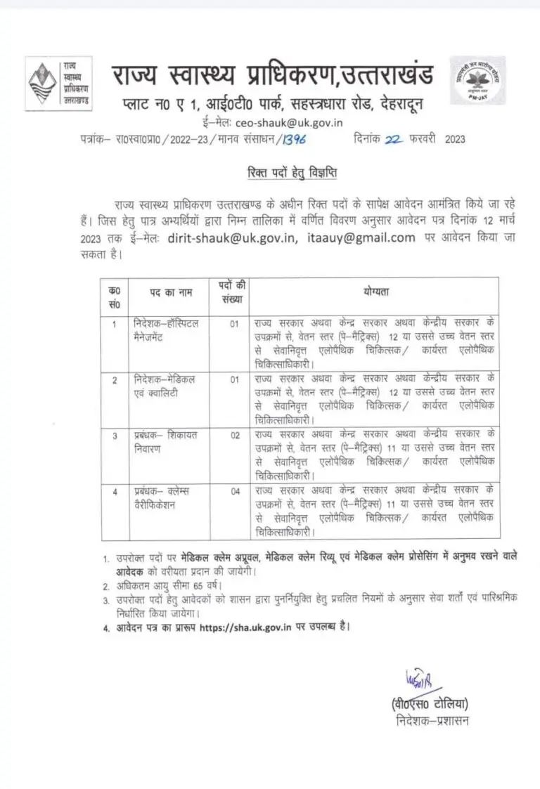 उत्तराखंड के युवाओं के लिए अच्छी खबर है। अगर आप लंबे समय से नौकरी की तलाश में है तो राज्य स्वास्थ्य प्राधिकरण उत्तराखंड में रिक्त पदों पर आवेदन मांगे गये है। उम्मीदवार नीचे दिये गये जानकारी को पढ़कर 12 मार्च तक आवेदन कर सकता है। नीचे दी गई डिटेल को ध्यानपूवर्क पढ़कर आवेदन करें…
