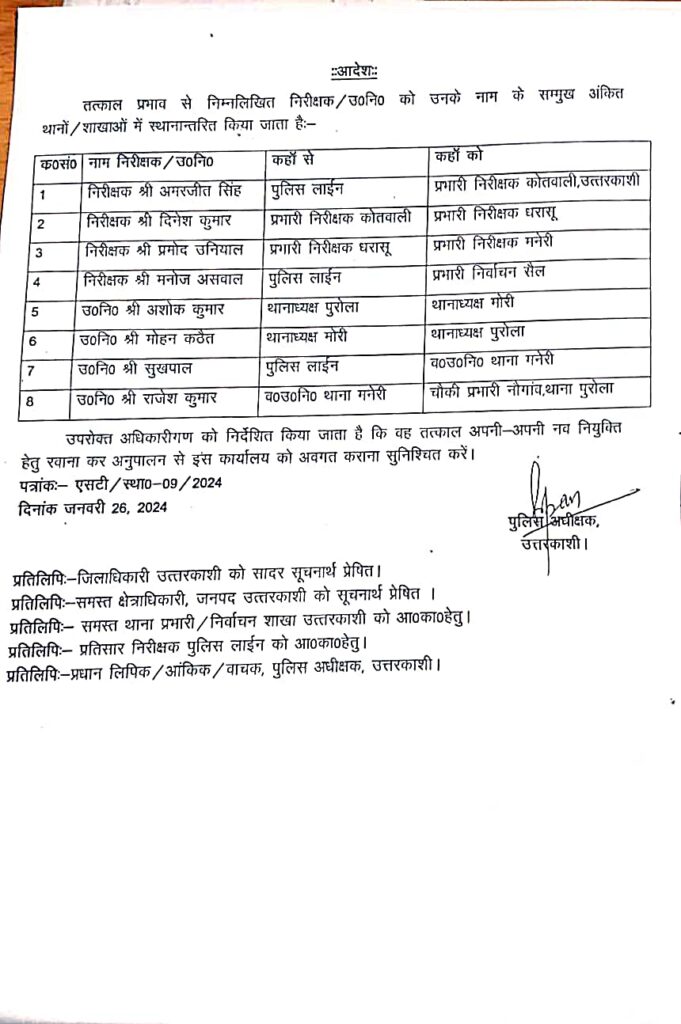 एसपी उत्तरकाशी ने जनपद में कई निरीक्षक व उपनिरीक्षकों के तबादले कर दिये हैं, निरीक्षक अमरजीत सिंह को कोतवाली उत्तरकाशी का प्रभारी निरीक्षक बनाया गया है, जबकी उपनिरीक्षक मोहन कठैत को पुरोला का थानाध्यक्ष बनाया गया है !
