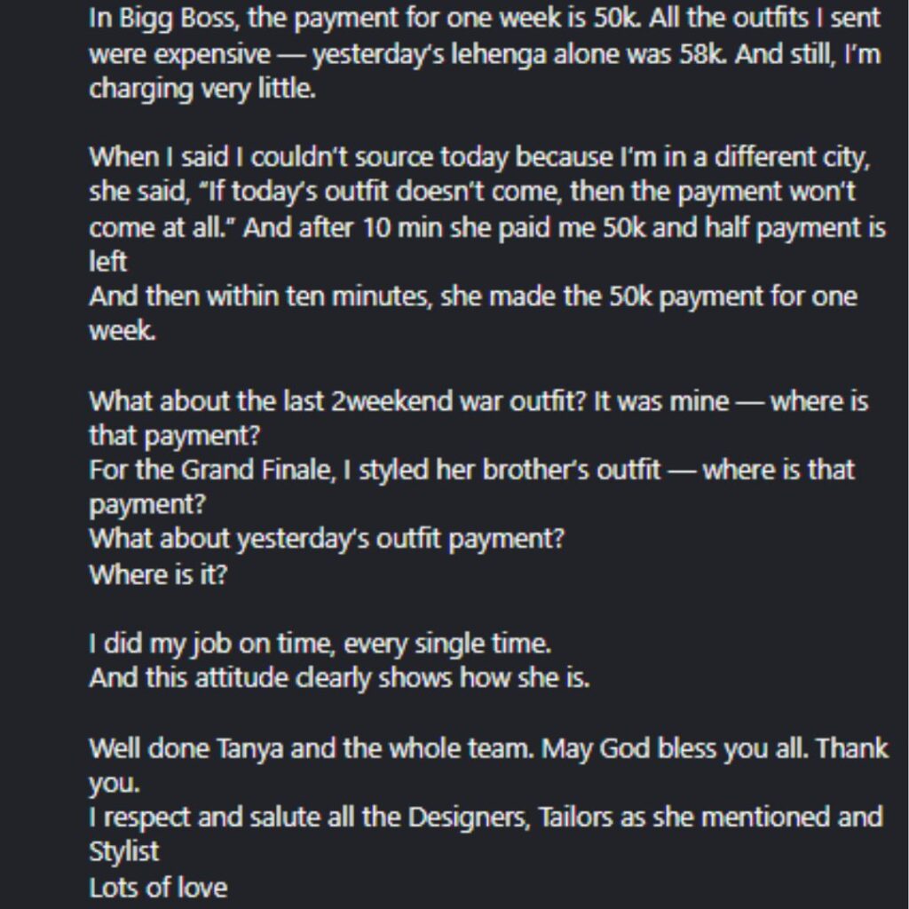 रिद्धिमा ने आरोप लगाया कि तान्या को भेजे गए कपड़े महंगे थे। हर साड़ी की कीमत लगभग 50 हजार रुपए थी, जबकि लहंगे की कीमत लगभग 58 हजार रुपए थी। इसके बावजूद तान्या ने भुगतान नहीं किया। रिद्धिमा ने कहा कि तान्या की टीम ने धमकी भी दी कि अगर आउटफिट समय पर नहीं भेजे गए तो भुगतान नहीं किया जाएगा।