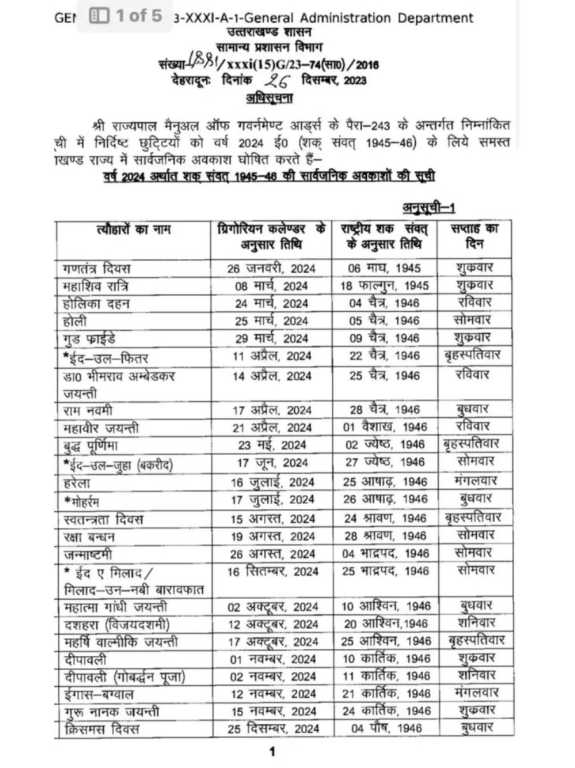 उत्तराखंड से आज की बड़ी खबर, शासन ने जारी की वर्ष 2024 की अवकाश सूची