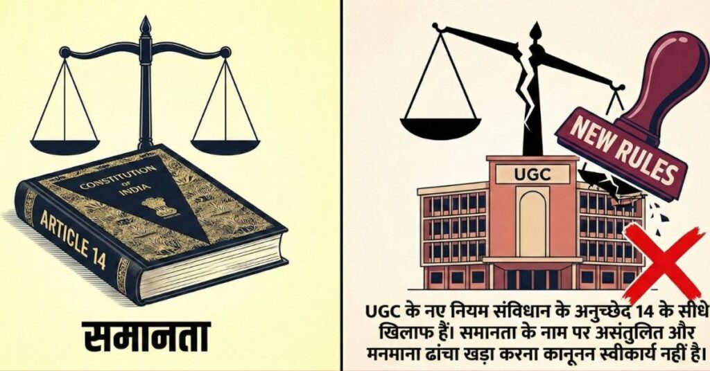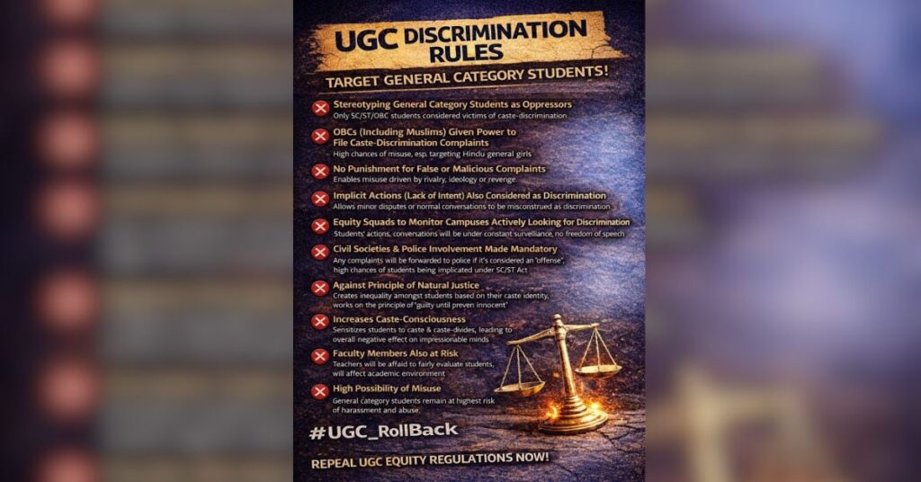 UGC इक्विटी कानून का विरोध मुख्य रूप से सामान्य वर्ग (जनरल कैटेगरी) के छात्रों और संगठनों से हो रहा है। सोशल मीडिया पर #UGCRollback जैसे हैशटैग ट्रेंड कर रहे हैं। आलोचक कहते हैं कि यह रिवर्स भेदभाव को बढ़ावा देता है, क्योंकि Equity Committee में जनरल कैटेगरी का प्रतिनिधित्व अनिवार्य नहीं है। इससे जांच प्रक्रिया एकतरफा लगती है और संविधान के अनुच्छेद 14 का उल्लंघन माना जा रहा है।