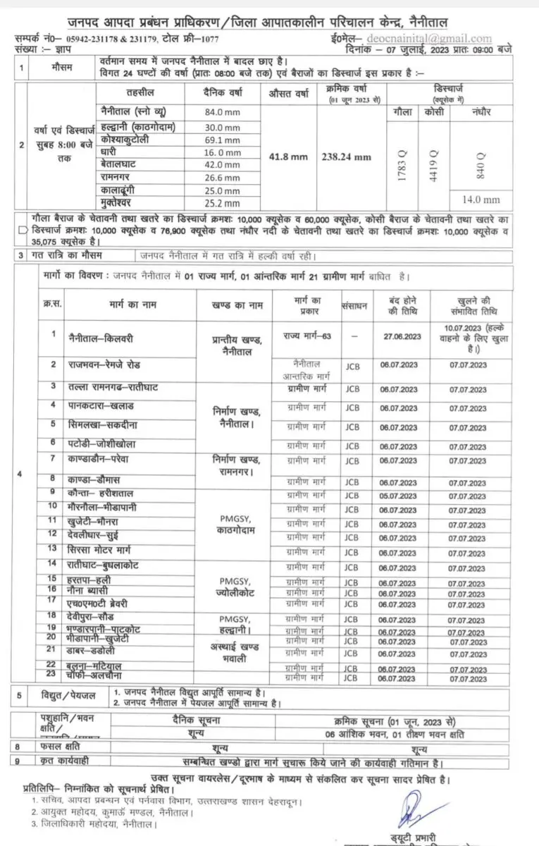 भारी बारिश के कारण जिले में एक राज्य मार्ग एक आंतरिक मार्ग और 21 ग्रामीण मार्ग बंद है जिनको खोलने का काम चल रहा है। शुक्रवार को भी भारी बारिश जारी है, जिलाधिकारी ने लोगों से नदियों के किनारों से दूर रहने की अपील की है। पहाड़ी इलाकों में भी गाढ, गधेरे उफान पर चल रहे हैं।
