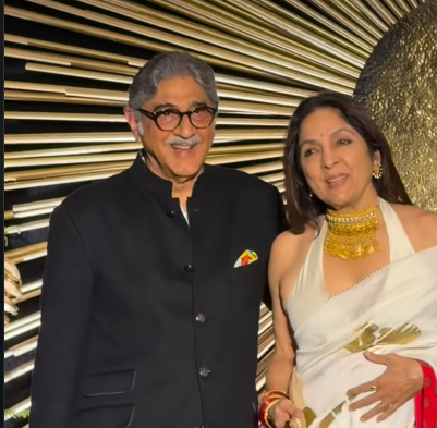 रिसेप्शन में नीना गुप्ता भी शामिल हुईं, जिसमें वे ऑफ-व्हाइट साड़ी और हॉल्टर-नेक ब्लाउज में बेहद सुंदर लग रही थीं।