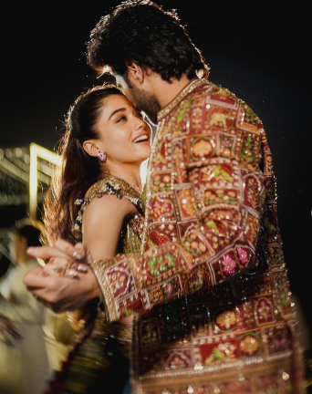 विजय देवरकोंडा ने रेड एंब्रॉयडरी वाली जैकेट और ब्लू धोती पहनी थी, जो उनके 'इंडो-वेस्टर्न' लुक को खास बना रही थी।