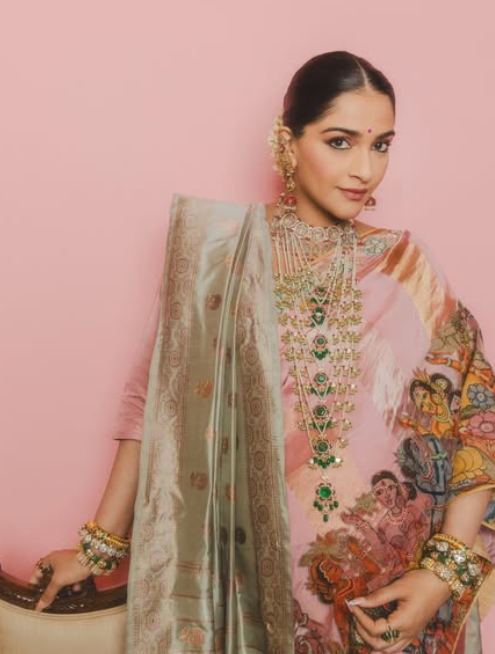 इन फोटोज में सोनम ने पिंक रंग की कलमकारी साड़ी पहनी है, जिसमें दुपट्टे की तरह पिस्ता और पिंक रंग की बलूचरी (रेशम की) साड़ी भी है।