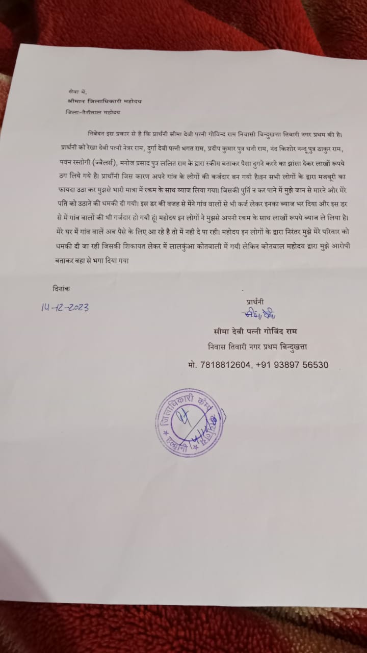 सीमा देवी ने गुरुवार डीएम कैम्प कार्यालय में शिकायत दर्ज करवाते हुवे कहा कि इन लोगो को ब्याज भरते भरते में पूरे गांव की कर्जदार हो चुकी हूं। परिवार को जान से मारने की धमकी ओर इज्जत के खातिर में इनको ब्याज देते रही। मेरे पास पैसे न होने और गांव वालों से कर्ज लेकर इनको ब्याज भरा जिस कारण में गांव की भी कर्जदार बन गयी। इन लोगो की शिकायत लेकर में लालकुंआ कोतवाली में गयी लेकिन कोतवाल महोदय द्वारा मुझे आरोपी बताकर वहा से भगा दिया गया। इन सभी के द्वारा चाकू की नोक पर मुझसे लिया गया लाखों रुपये मुझे लौटाया जाए जिससे में गांव वालों का कर्ज चुका सकू।